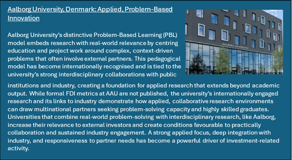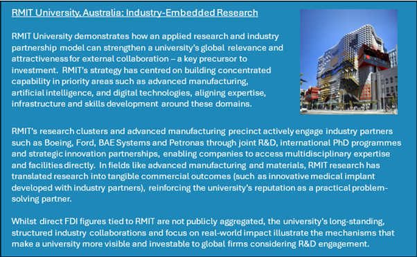 These brief case studies demonstrate how universities attract FDI not simply through scale or global reputation, but through the strength of their alignment with industry, their role within regional ecosystems, and their ability to signal capability to external investors. Three common factors emerge from the four examples: