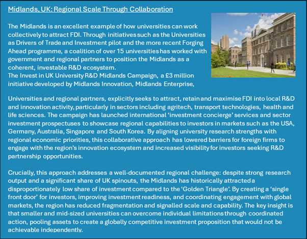 While large, research-intensive institutions dominate current investment flows, this reflects patterns of concentration rather than inherent limitations. Mid-sized and smaller universities are not inherently disadvantaged in attracting FDI. By leveraging research specialisation, regional partnerships, and collaborative strategies, it is possible to compete on a global stage. Evidence from the Midlands pilot, and other international examples, shows that even modest- sized institutions can contribute significantly to regional innovation, international collaboration, and investment attraction.